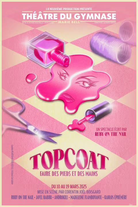 Ne manque pasTOPCOAT, la nouvelle création de Ruby On The Nail. Pris·es dans une journée interminable au sein d’un nail salon déserté, les employé·e·s se retrouvent face à leurs émotions, leurs peurs et leurs désirs. Un mélange entre comédie musicale, théâtre et drag show, TOPCOAT déploie un univers éclatant de couleurs et d’émotions à la portée universelle. Une ode à l’expression de soi, à la diversité et à la liberté incarnée par les artistes qui sont et font le drag. Achète tes billets dès maintenant pourTOPCOATau Théâtre du Gymnase à Paris !